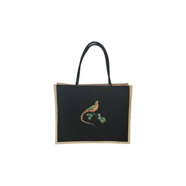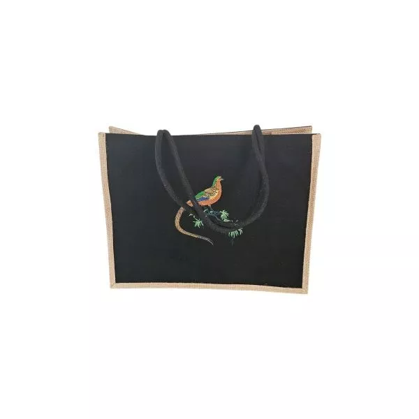 Sacosa cumparaturi cu fazan, eleganta si practica, aceasta sacosa este confectionata din bumbac doc si iuta de calitate superioara, avand dimensiunea de 41 x 33x 18 cm – ideala pentru cumparaturi sau utilizarea zilnica. Broderia cu fazan adauga un detaliu deosebit, ce imbina frumusetea naturii cu utilitatea unui accesoriu rezistent.